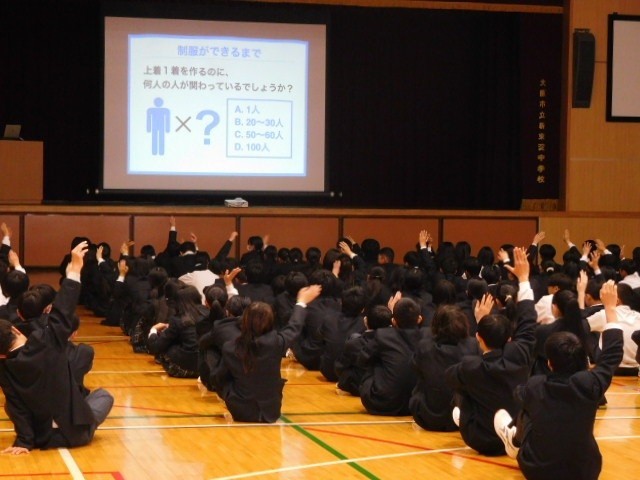 また、クイズ等を取り入れながら、制服を作るのにどれ程の人の手が関わっているのか、ということも教えてくださいました。