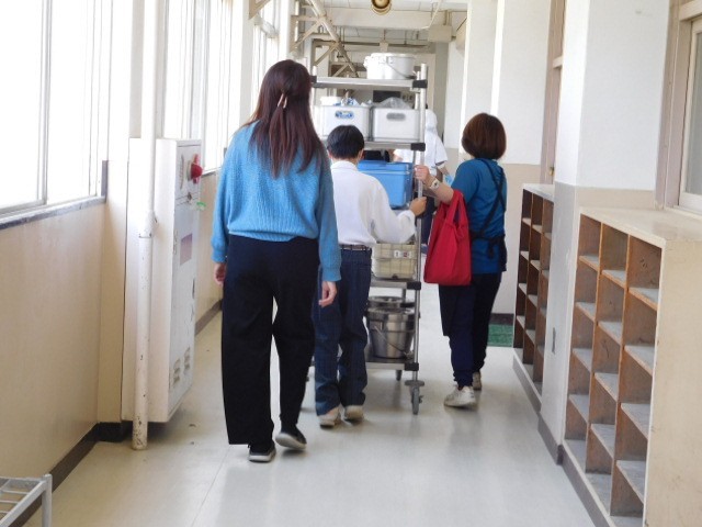 カートに返却する容器・食器を給食配膳室へ返却します。