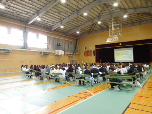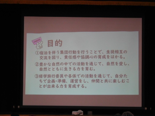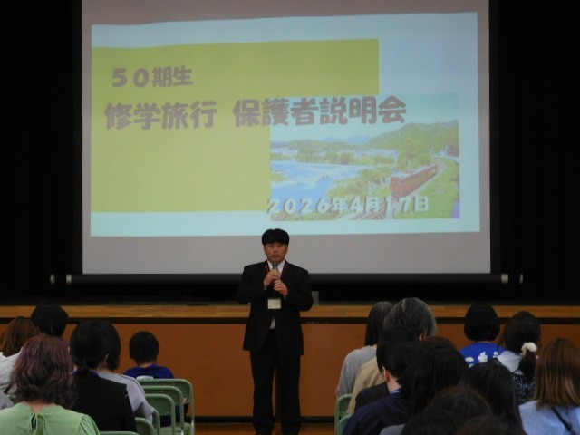 講堂にて、50期生修学旅行保護者説明会を行いました。