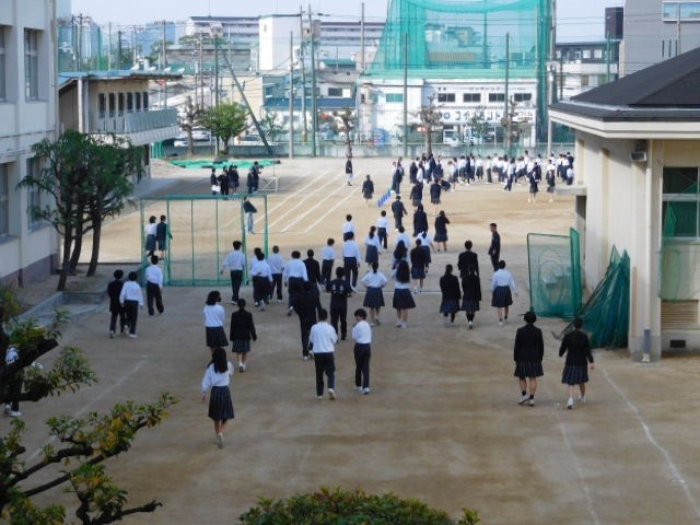 今日はグラウンドで全校集会がありますので、生徒のみなさんは教室に荷物を置いてすぐ、グラウンド集合になります。