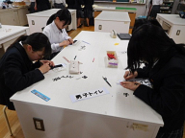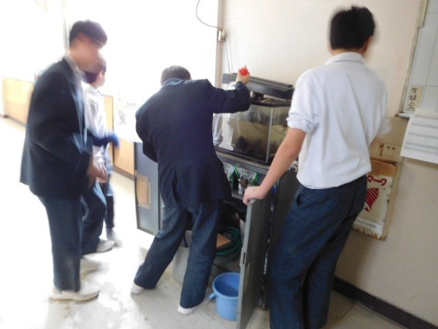 写真は理科部と家庭科部で、理科部は「プレコの水槽」の水交換、家庭科部はトイレの表示板作成を行っていました。