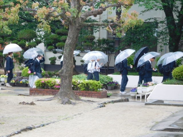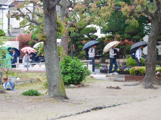 今日は時間とともに雨足が強くなり、傘をさしての登校となりました。