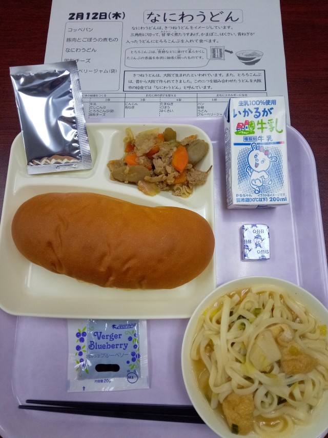 2月12日(木)本日の給食メニューはコッペパン豚肉とごぼうの煮ものなにわうどん固...