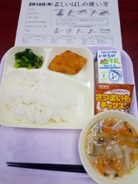 2月16日(月)本日の給食メニューはごはんたらフライうすくず汁こまつなのごまあえ...