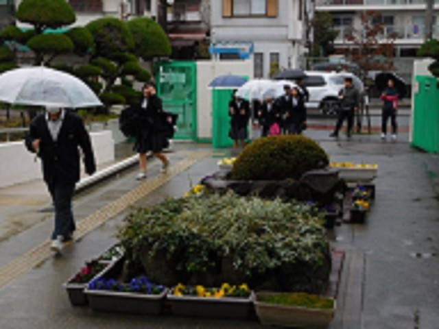 3月3日(火)本日の登校の様子です。小雨ではあったので、傘をささずに登校する生徒...