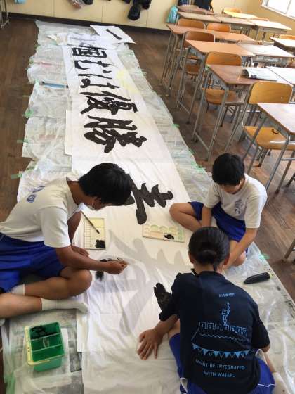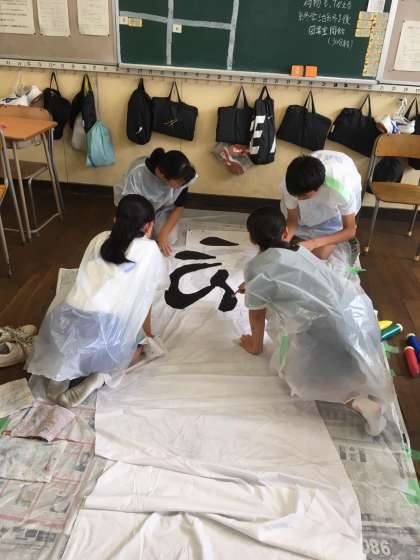 生徒会の皆さんが、夏休み中に体育大会テーマの横断幕の制作に取り組んでます。