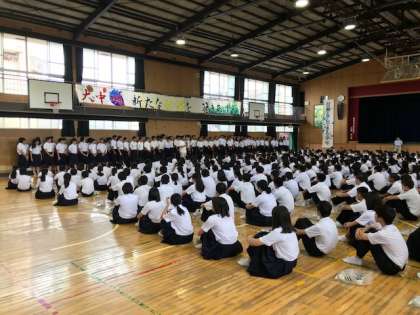 今朝は、3年生の代表が、体育大会で歌う「校歌」のお手本を示してくれました。