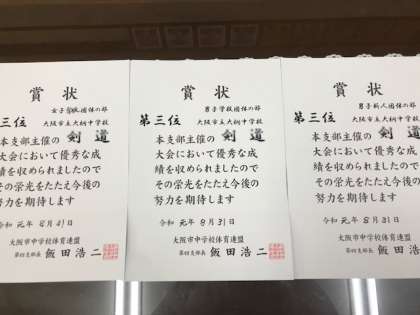 今日の全校集会で、剣道部の表彰状(男子団体・女子団体・新人男子団体それぞれ第三位)の伝達がありました。