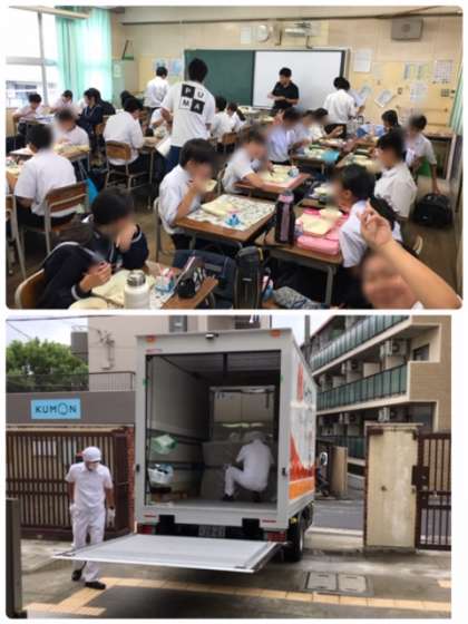 いつもこのようにして、大道南小学校と東井高野小学校から給食を運んでいもらってます。