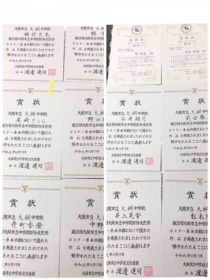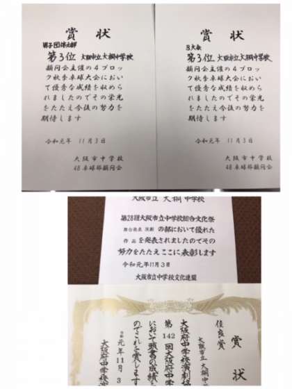 全校集会で、卓球部・美術部・演劇部が獲得した、表彰状を伝達授与し、活躍を紹介しました。