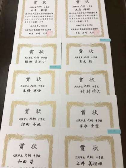 3年生の美術作品があべのハルカスで開催されていた「造形展」で展示され、今日の全校集会で表彰状を伝達授与して、紹介しました。