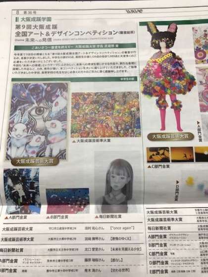 大阪成蹊学園の広報誌に先日の「第9回 全国アート&デザインコンペティション」で芸術準大賞に選ばれた、2年生の宮崎舞琴さんの受賞が紹介されていました。
