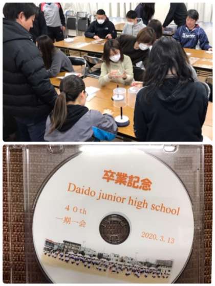 PTAの皆さんと本校職員で、卒業生に渡す「記念DVD」のラベル張り作業をしました。例年は、「大中ナビの会」が作成・編集していただいてますが、今年は学年の職員(主任)が作成・編集にあたりました。
