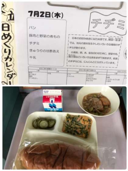 豚肉と野菜の煮物、チヂミ、キュウリの甘和え