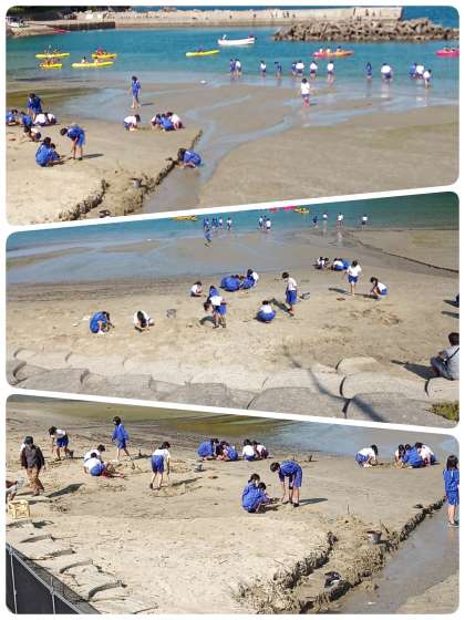 砂浜の砂にスコップや手で、砂をいろいろな形にしていきます。