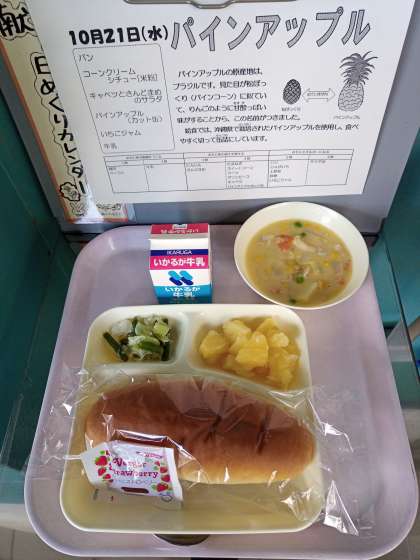 パインアップルの原産地はブラジルですが、給食では沖縄県で栽培されたパインアップルを使用し、食べやすく切って缶詰にしているそうです。