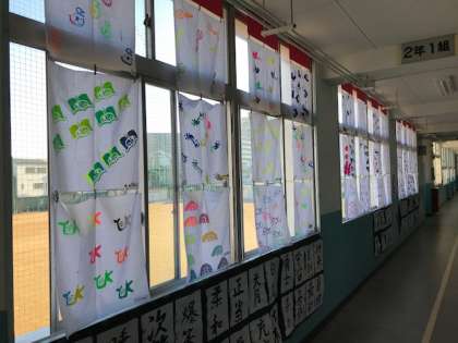 2年生は、美術の授業で風呂敷を作成し、廊下に展示されています。