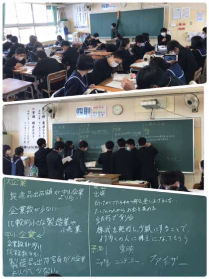 3年生は、社会科で「企業の種類と役割」について学習し、グループワークで「他の会社より売れるアイデア」「公企業と私企業の長所・短所」「この冬株価が上がりそうな企業」など学びを深めています。