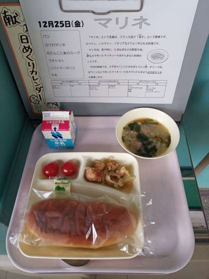 今日の給食では、うす切りにしたたまねぎとりんご酢、オリーブ油、白ワインなどで作ったマリネソースを「さけ」にからませた「さけのマリネ」が出ます。