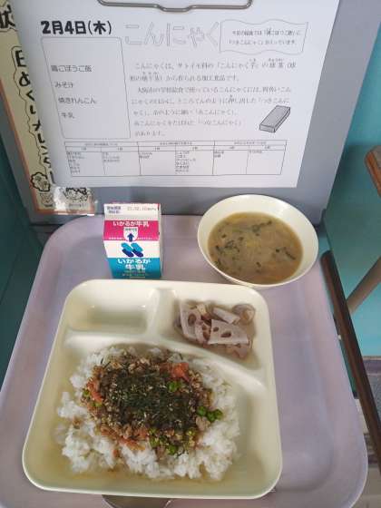 今日の給食では「鶏ごぼうご飯」に「つきこんにゃく」が入っているそうです。