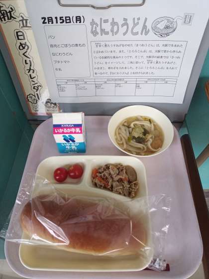 大阪市の給食では、このふたつを合わせて食べる今日のメニューを「なにわうどん」と名付けたそうです。