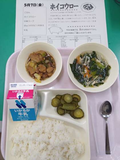今日の給食では、豚ばら肉をゆでてから、ほかの材料と一緒にいためているそうです。
