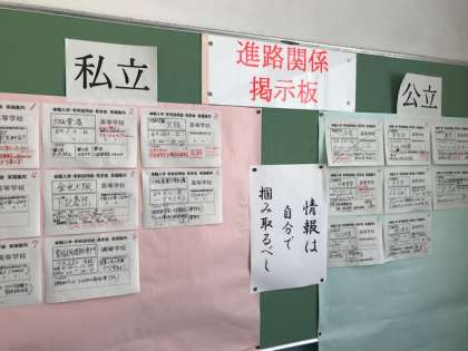 上:3年掲示板に進路情報が掲示されています。「各高校の体験入学や学校説明会」について掲示されています。