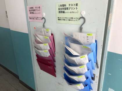 下:1年生の理科では、自主学習の課題が自由にとれるように廊下に掲示されています。