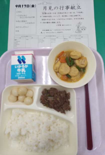 今日の給食では、月見をする時に(豊作に感謝して)供える、いもやだんごが献立に出てきます。