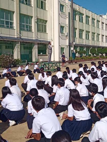 上:緊急事態宣言解除を受け、今まで放送で行っていた全校集会をグランドで行いました。