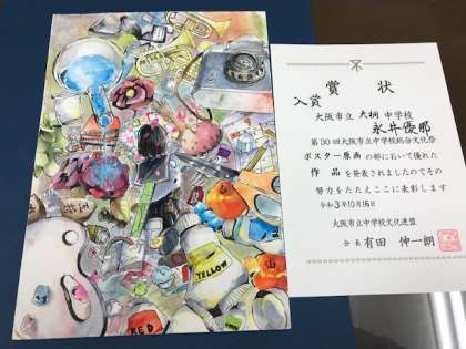 今朝の全校集会で、先日開催された「大阪市総合文化祭」で入賞した美術部員の表彰状を紹介しました。