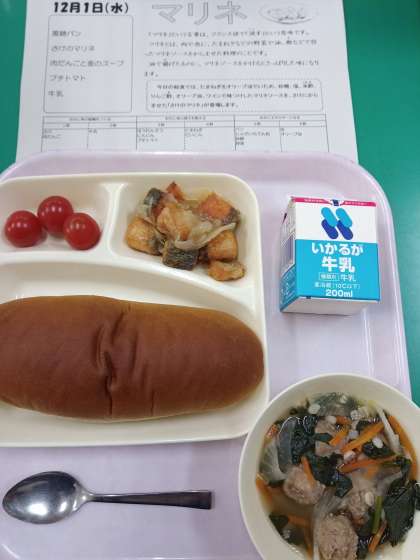 今日の給食の「さけのマリネ」は、たまねぎをオリーブ油でいため、砂糖、塩、米酢、りんご酢、オリーブ油、ワインで味つけしたマリネソースを、さけにからませているそうです。
