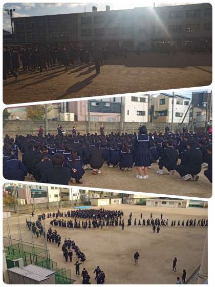 地震発生を想定し、一旦各教室で机の下に避難してから、グランドに集合しました。