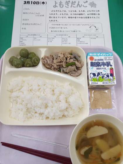 今日の給食では、あまいみつをからめた「よもぎだんご」にきな粉をかけて食べます。