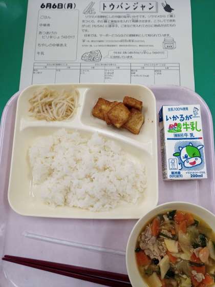 「トウバンジャン」はソラマメを原料にした中国の塩(から)辛いみそで、今日の「あつあげのピリ辛じょうゆかけ」に使用されているそうです。
