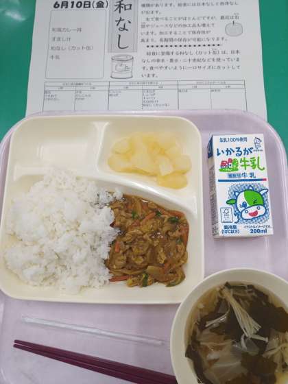給食に登場する和なしは、日本なしの「幸水(こうすい)」・「豊水(ほうすい)」・「二十世紀」などが使われているそうで、食べやすいように一口サイズにカットされていますよ。