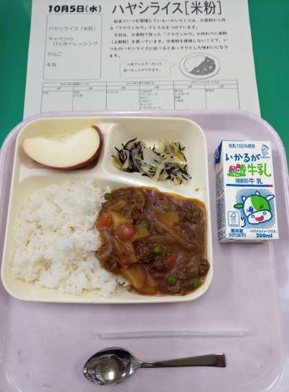 今日の「ハヤシライス」では、小麦粉ではなく米粉(上新粉)でとろみをつけているそうです。