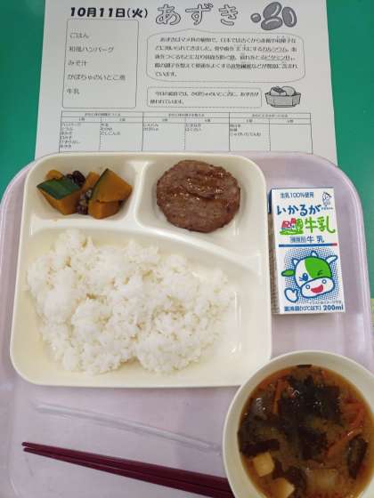 今日の給食では、かぼちゃのいとこ煮(に)に、カルシウム・鉄・ビタミンB1・食物繊維など栄養たっぷりの「あずき」が使用されています。