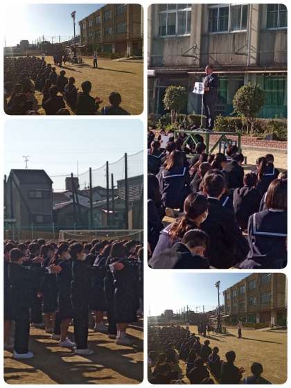 雲ひとつない秋晴れの空のもと、全校集会を実施しました。