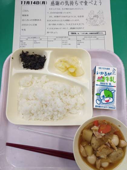 今日の「関東煮」にはうずら卵が使用されていますので、今日は「個別対応献立実施日」となっています。