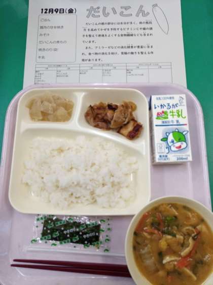 「だいこん」は、冬が旬(しゅん)の食材で、体の抵抗力(ていこうりょく)を高めてかぜを予防するビタミンCを含んでいます。