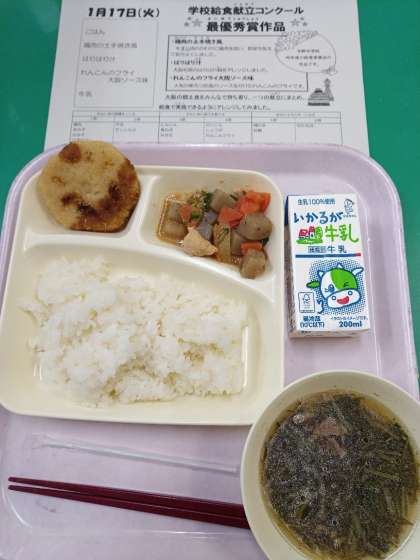 今日の献立は、学校給食献立(こんだて)コンクールで最優秀賞となった、平野中学校昨年度の給食委員会の作品だそうです。