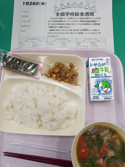 今日1月24日は、戦争によって中断されていた給食が、昭和21(1946)に再開されたことを記念する「学校給食感謝の日」だそうです。