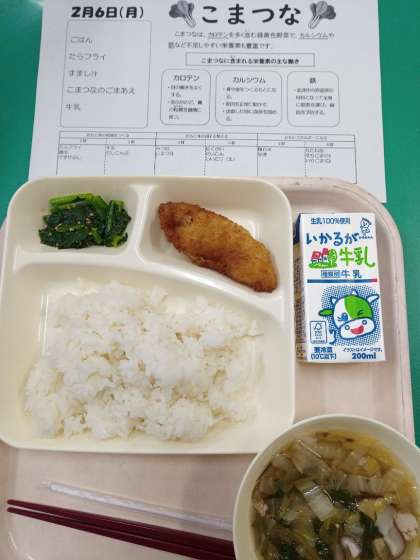 今日の給食に使われてる「こまつな」は、カロテンを多く含(ふく)み、カルシウムや鉄など、不足しやすい栄養素も豊富な緑黄色野菜です。