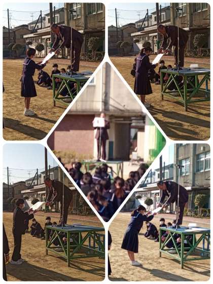 賞状伝達にて、次年度から導入される新しい標準服(制服)のエンブレムを考案してくれた人、絵画・写真コンクールで表彰を受けた人、日本拳法の全国大会で入賞し教育長表彰を受けた人、それぞれの生徒の皆さんに、校長先生から賞状や記念品が手渡されました。