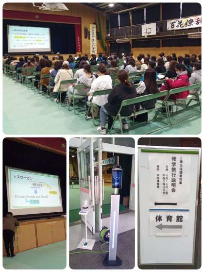 本日15時30分より、本校体育館にて3年生保護者に向けて修学旅行説明会を実施いたしました。