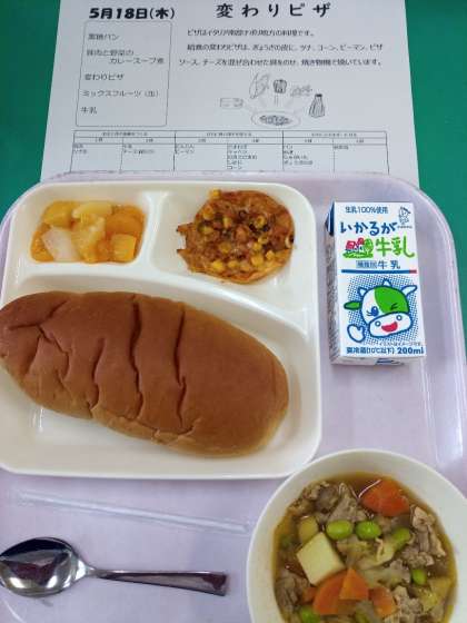 今日の献立の「変わりピザ」は、ぎょうざの皮にツナ、コーン、ピーマン、ピザソース、チーズを混ぜ合わせた具をのせ、焼き物機で焼いているそうです。