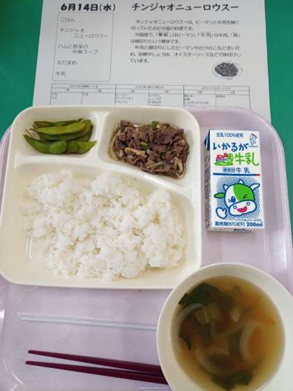 ところで、チンジャオニューロウスの牛肉と、その隣にある「えだまめ」は、どちらも同じたんぱく質ですね。