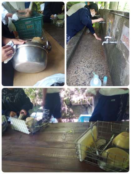 カレーライスをおいしくいただいたあとは、鍋にこびりついた「すす」をクレンザーでしっかりこすり洗いするなどして、元あった状態に戻して用具などを返却しました。