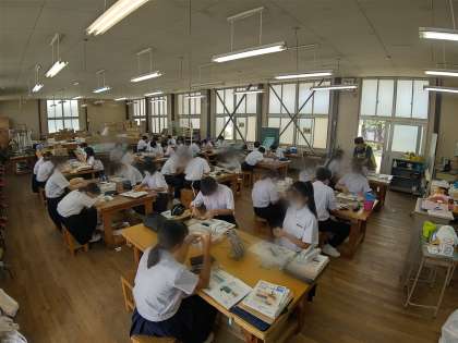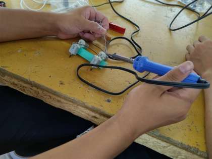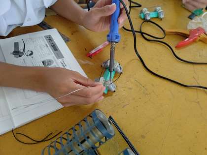 2年生の技術科で、はんだ付けをしています。エネルギー変換に関する技術のところで、プチロボの製作を行っています。